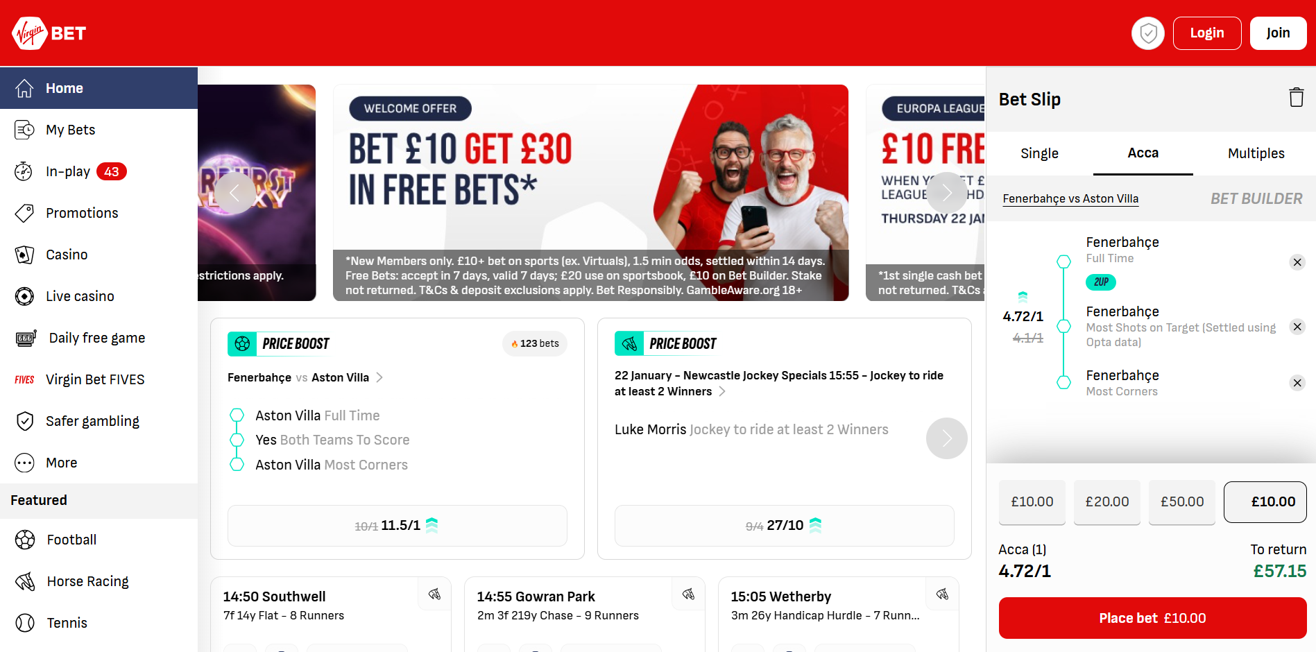 | Virgin Bet | 4.8/5 | Bet £10 Get £40 | Football Betting |